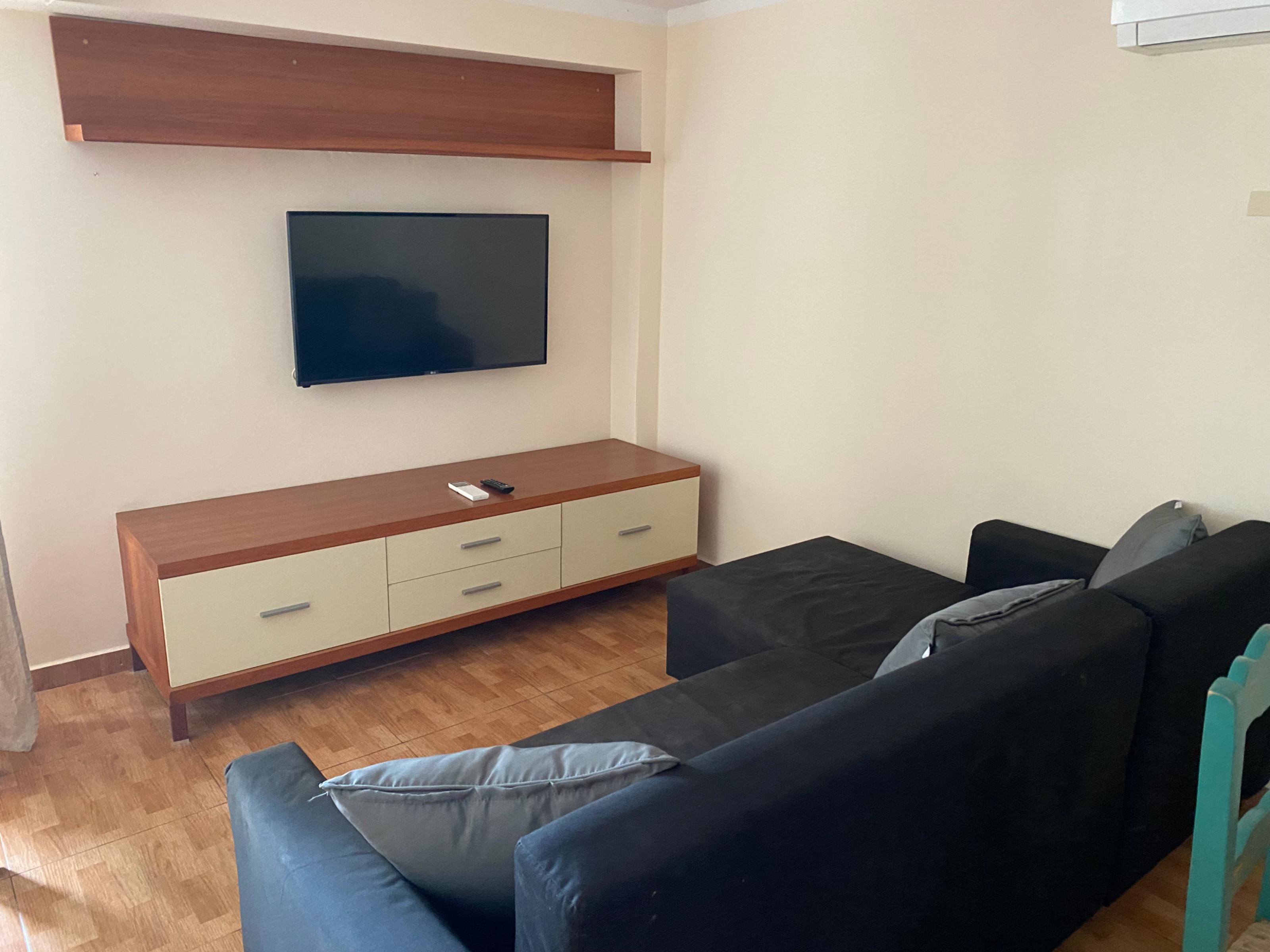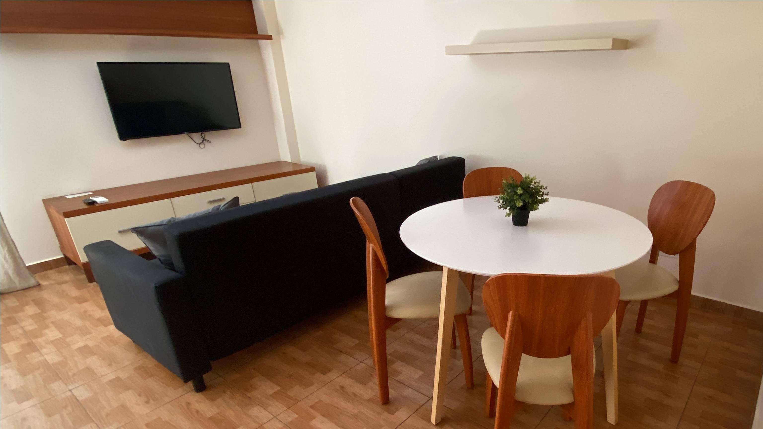 utensilios para cocinar, vajilla y cubertería. Salón con sofá, TV con canales internacionales, vía satélite,
